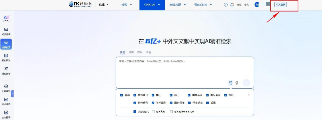 登录个人账号,学校IP范围内自动绑定机构CNKI AI权益使用